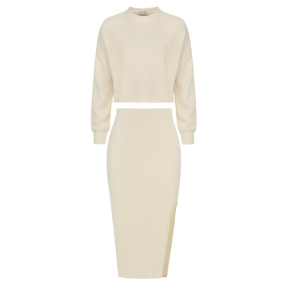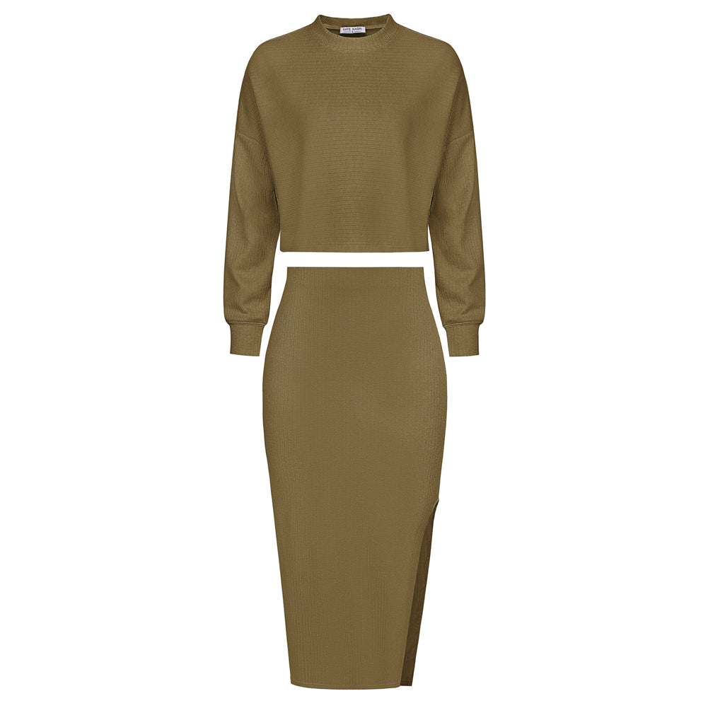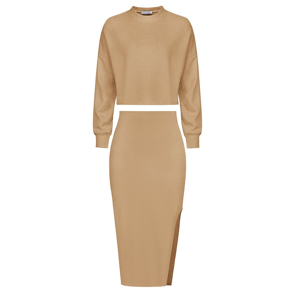 - TWO PIECE ELEGANCE: Indulge in the sophisticated charm of Kate Kasin Women Skirt Set, featuring a cropped length top with long sleeve dropped shoulders and a matching elastic waist left slit skirt that hits at mid-calf for a graceful silhouette.